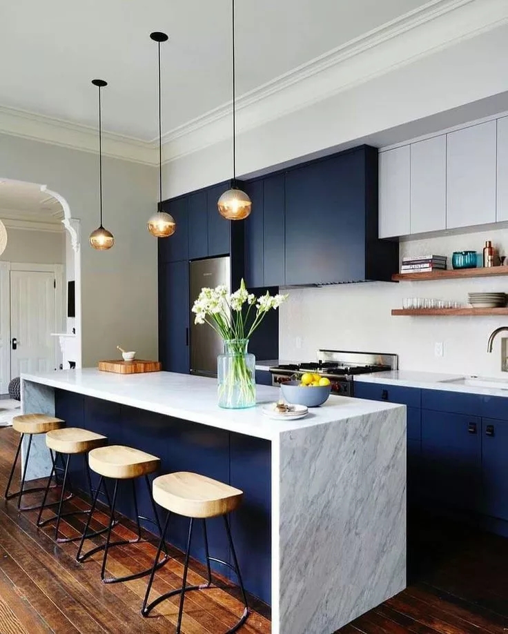 蓝色系的厨房:显得高冷范十足。搭配带有花纹的墙砖或大理石,为厨房增添了艺术气息。这样的厨房设计,十分符合男性清新俊朗的形象。