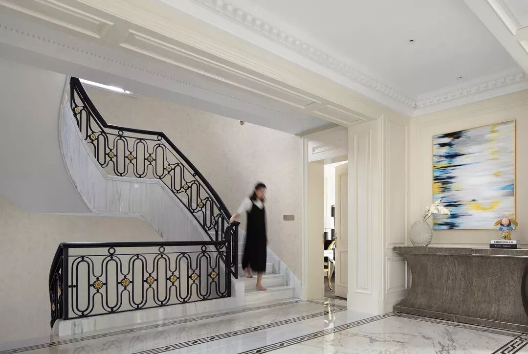 蜿蜒的楼梯盘旋而上,贯穿于楼层之间,金与黄带有古典造型的楼宇也使得空间更精神。