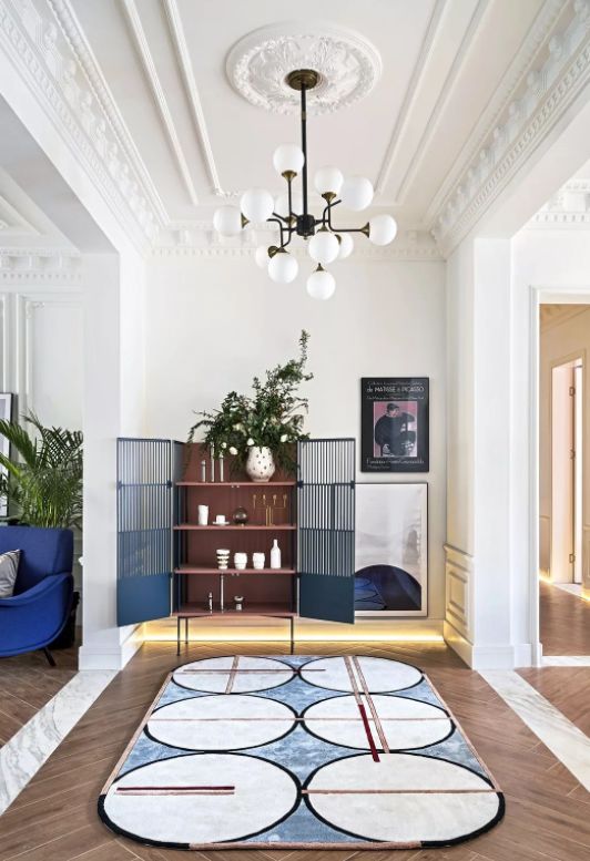门厅又称为玄关,很多人都希望在这个区域里能有一些仪式感,毕竟入户第一眼见到的空间便是于此。巧妙地利用地毯、小边柜等软装元素可以让玄关更抓眼球,凸显时尚感。