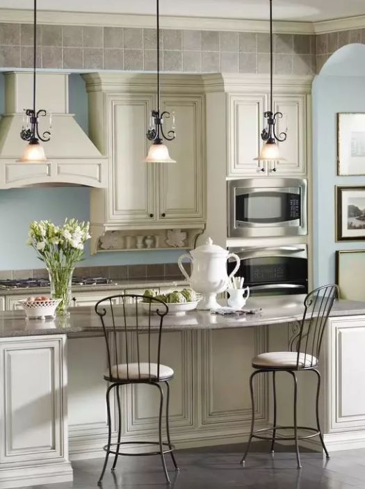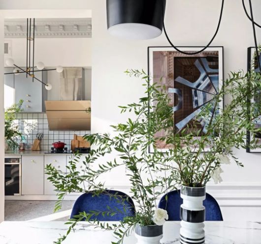 而厨房的硬装是整个屋子硬装的重头戏之一,把常规厨房顶上,用来预埋烟道线管的区域,全部做在了吊柜以上的墙面区域,保留了层高,又未占任何储物功能,色彩上,保留了墙面的白色,反常规地将顶面做漆,增加了空间的精致感及耐脏性。