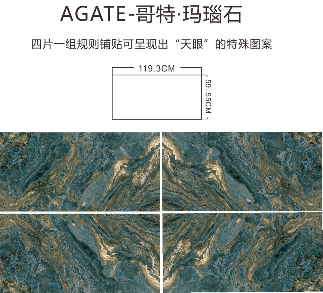 哥特砖面浮翠流丹,四片一组规则铺贴可呈现出“天眼”的特殊图案,既能张狂又能冷艳。玛瑙石的纹理,复杂扭动,如西班牙王室般奢华优雅又梦幻神秘。