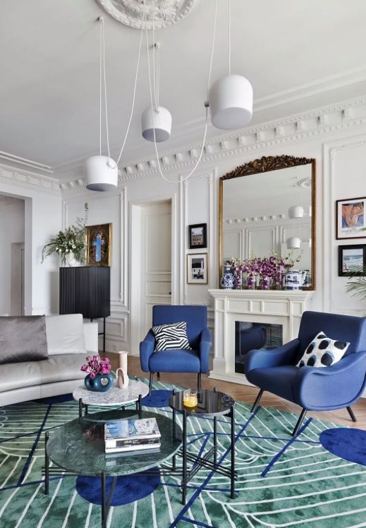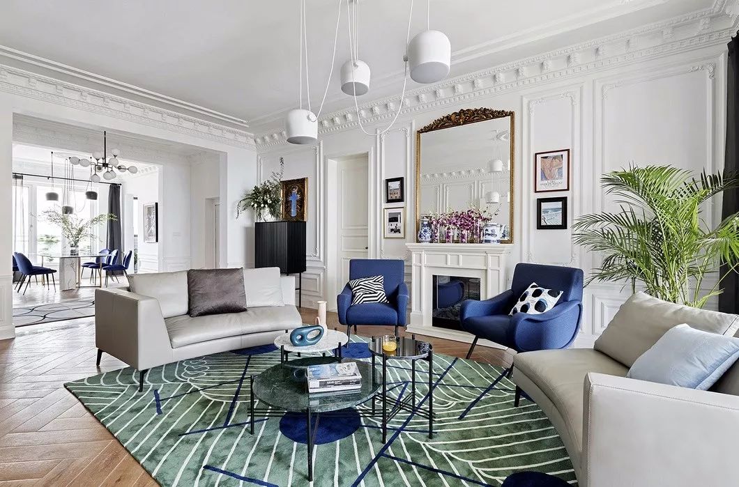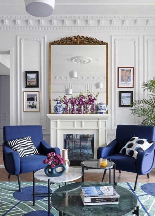 值得一提的是壁炉上的金色画框镜,不仅将整个空间都变大了,透过镜子还能看到家的另一个世界,别有一番风味。