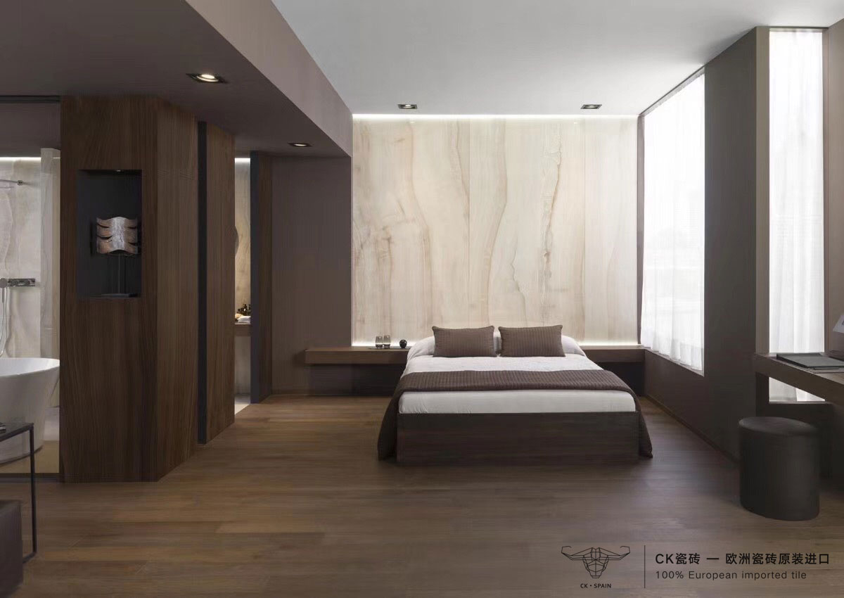矮床搭配木纹砖可谓是天作之合,选用浅色木纹砖清新淡雅,可以让面积小的卧室从视觉上更为宽敞;而选择深色的木纹砖,沉稳内敛,卧室瞬间变成梦幻般的大幅面艺术品。